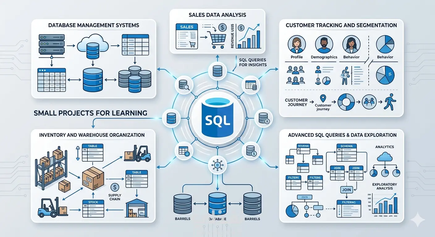 أفكار ومشاريع صغيرة لتعلم وإتقان قواعد البيانات باستخدام SQL: تطبيقات عملية لإدارة البيانات، تحليل المبيعات، تتبع العملاء، تنظيم المخزون، واستكشاف الاستعلامات المتقدمة لتحسين العمليات واتخاذ القرارات المبنية على البيانات.