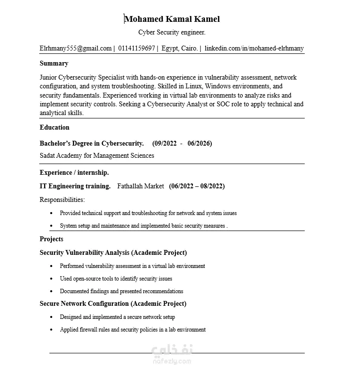 سواء كنت طالب، حديث تخرج، أو تمتلك خبرة، سأساعدك في إبراز نقاط قوتك بشكل يجعل سيرتك الذاتية مميزة وسهلة القراءة.
