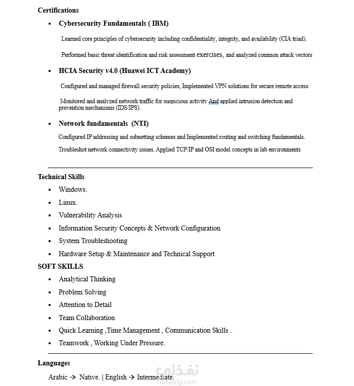 أقوم بإعادة صياغة المحتوى بشكل احترافي، مع تصميم عصري وواضح يناسب متطلبات سوق العمل، ويكون متوافقًا مع أنظمة التوظيف (ATS) التي تستخدمها الشركات في تصفية السير الذاتية.