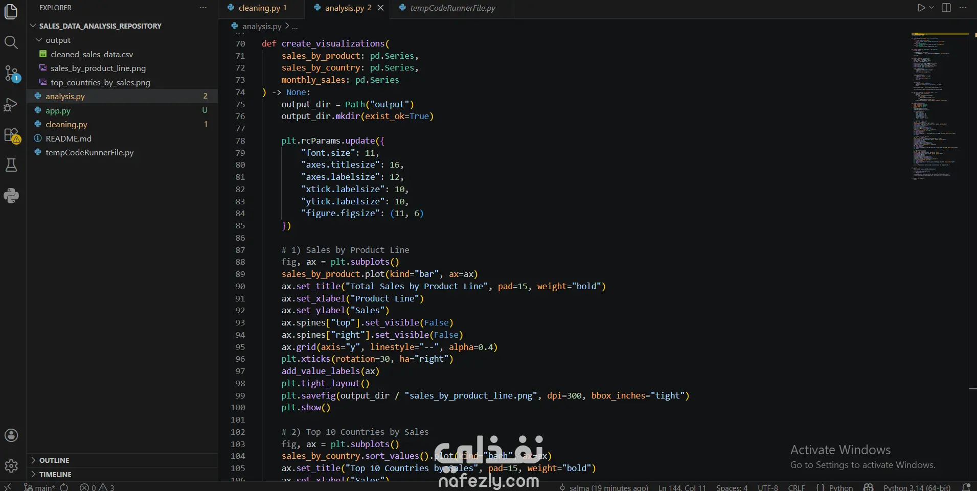 محللة بيانات قمت بتنفيذ مشروع متكامل لتنظيف وتحليل بيانات مبيعات باستخدام Python وPandas وMatplotlib. شمل المشروع تنظيف البيانات، معالجة القيم المفقودة، إزالة التكرارات، وتوحيد تنسيق الأعمدة وتحويل أنواع البيانات. تم بعد ذلك تحليل البيانات لاستخراج رؤى مهمة حول أداء المبيعات، مثل أعلى خطوط المنتجات، أفضل الدول من حيث الإيرادات، واتجاهات المبيعات عبر الزمن. كما تم إنشاء تصورات بيانية احترافية لتوضيح النتائج بشكل واضح وسهل.