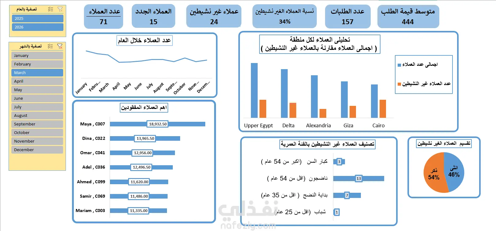 مشروع تحليل بيانات يهدف إلى فهم أسباب فقدان العملاء (Churn) وتحديد العوامل التي تؤثر على استمرار أو مغادرة العملاء. تم استخدام Excel لتحليل البيانات وبناء تقارير تساعد على فهم سلوك العملاء. خطوات العمل: تنظيف البيانات ومعالجة القيم المفقودة تحليل العملاء حسب الحالة (نشط / مغادر) مقارنة سلوك العملاء حسب الفئات المختلفة استخدام Pivot Tables وCharts لاستخراج الأنماط النتائج والرؤى: تحديد العوامل الأكثر تأثيرًا على فقدان العملاء معرفة الفئات الأكثر عرضة للتسرب تقديم رؤى لتحسين الاحتفاظ بالعملاء