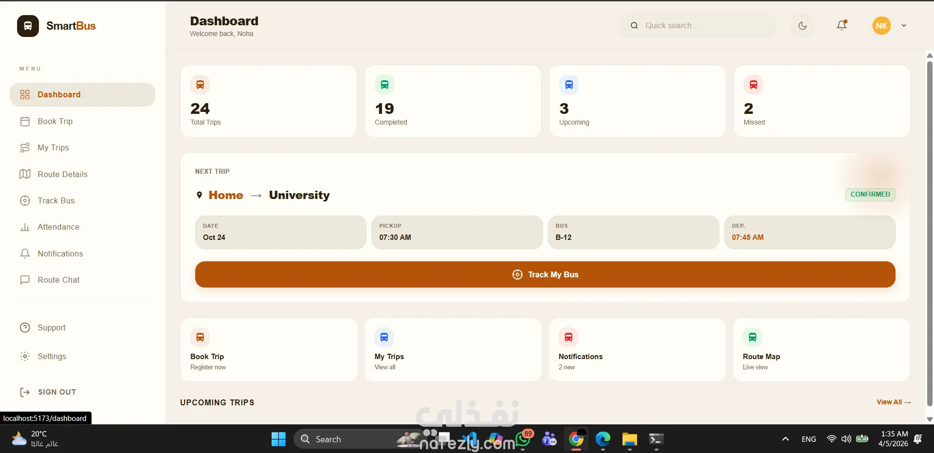 SmartBus هو موقع إلكتروني متكامل باستخدام MERN Stack مع TypeScript، يقدّم نظاماً ذكياً لإدارة وتتبع النقل الجامعي بطريقة عصرية وفعّالة. يتيح النظام للإدارة والطلاب متابعة الحافلات، تنظيم الرحلات، وإدارة بيانات السائقين والمسارات من خلال واجهة سهلة الاستخدام وسريعة الأداء مميزات المشروع بناء واجهة مستخدم كاملة (Frontend) بتصميم حديث وتجربة استخدام ممتازة. تطوير API Backend متكامل باستخدام Node.js + Express. ربط النظام بقاعدة بيانات MongoDB مع تصميم سكيمات منظمة. تنفيذ نظام تسجيل دخول آمن باستخدام JWT. إنشاء صفحات ولوحات تحكم وأدوات إدارة (Students – Drivers – Buses – Trips). إضافة Live Tracking UI لعرض مواقع الحافلات في الوقت الفعلي. التزام كامل بمعايير الأداء، الأمان، وتنظيم الكود.