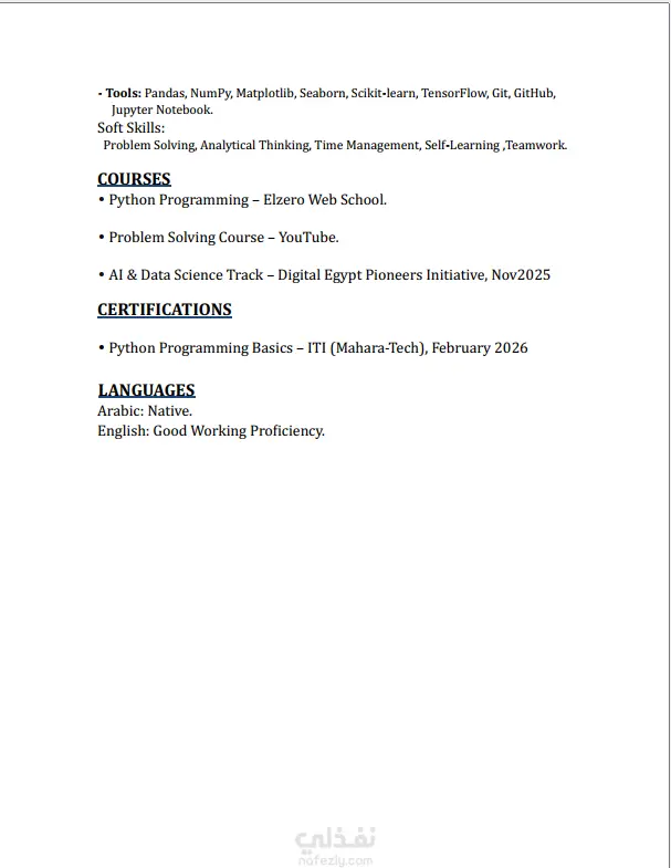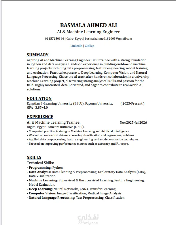 يتم التركيز على تنسيق بسيط ومنظم يسهل على أنظمة الـ ATS قراءته، مع إبراز المهارات التقنية مثل Machine Learning, Deep Learning, Data Science, Python وغيرها بشكل واضح واحترافي. كما يتم ترتيب الخبرات والمشاريع بطريقة تساعد على إظهار قوة المرشح وزيادة فرص قبوله في الوظائف أو الإنترنشيب.