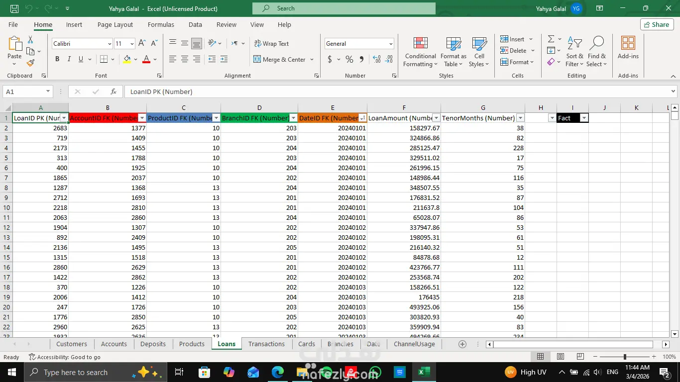تنظيف و ترتيب بيانات احدى البنوك عبر اكسيل قبل تسليمها لمحلل البيانات للعمل على تحليلها