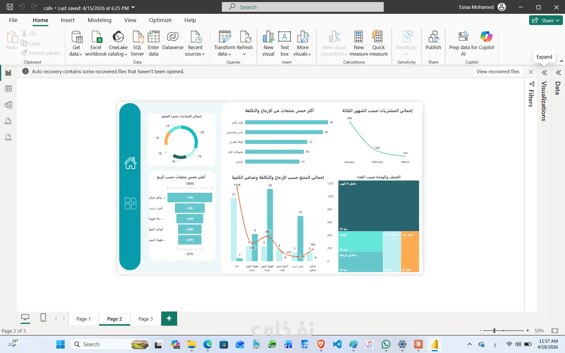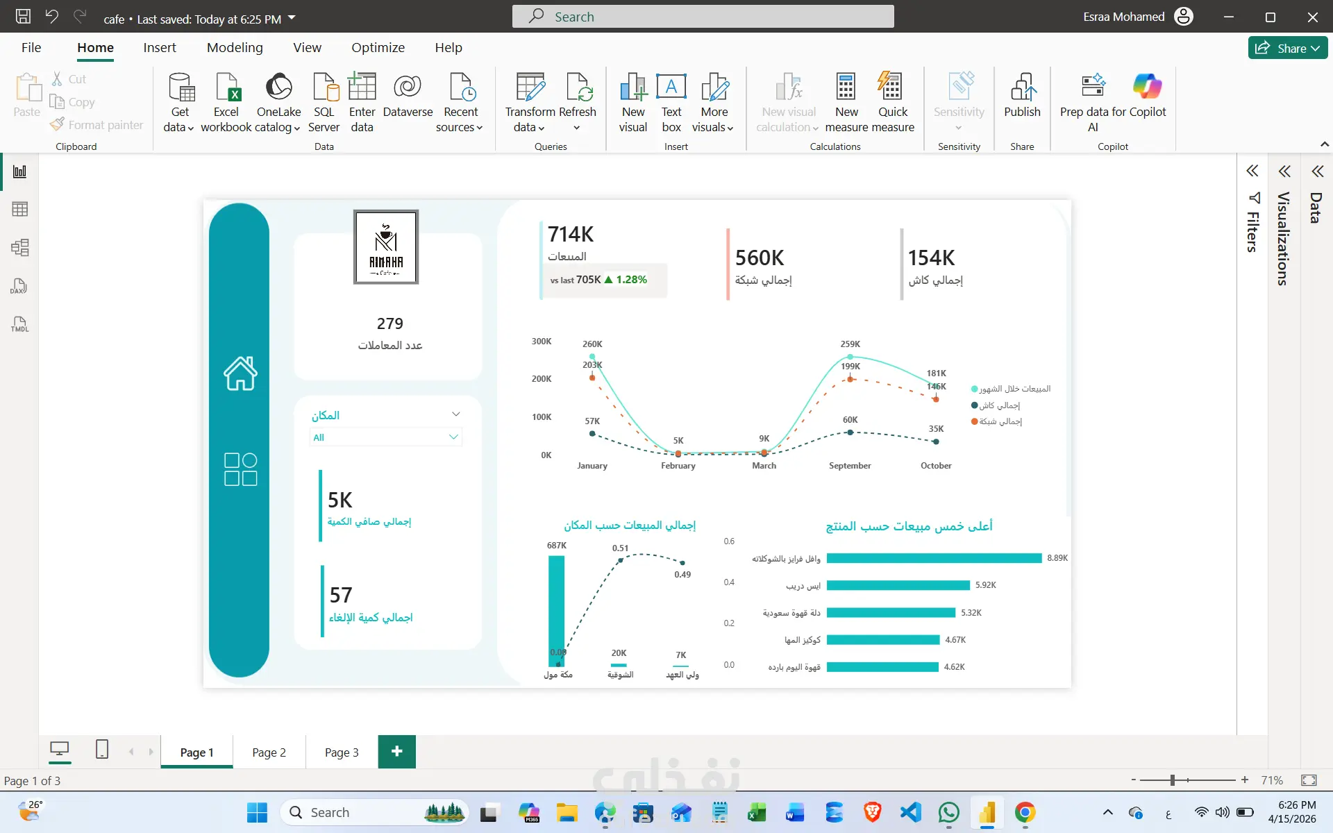 قمت بتصميم وبناء لوحة تحكم تفاعلية لتحليل أداء مبيعات كافيه ، تتضمن: متابعة إجمالي المبيعات بقيمة 714K مع مقارنة بالفترة السابقة وتتبع نمو 1.28% تحليل طرق الدفع - شيكات (560K) ونقدي (154K) تتبع المبيعات الشهرية عبر مخطط زمني تفاعلي تحليل المبيعات حسب الموقع (مكة مول، الشوقية، وادي العهد) أعلى 5 منتجات مبيعاً مع تحديد الأكثر إيراداً فلترة ديناميكية حسب المكان