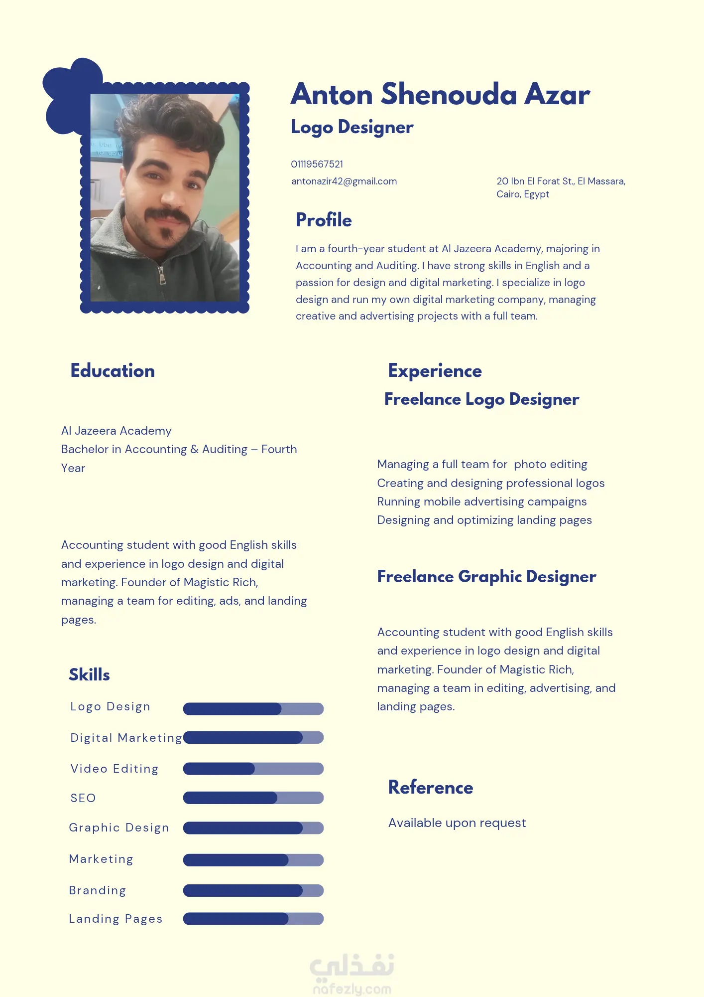 أقدم خدمة تصميم وكتابة سيرة ذاتية (CV) احترافية تساعدك في التقديم على الوظائف بشكل قوي وتزيد فرص قبولك في المقابلات.