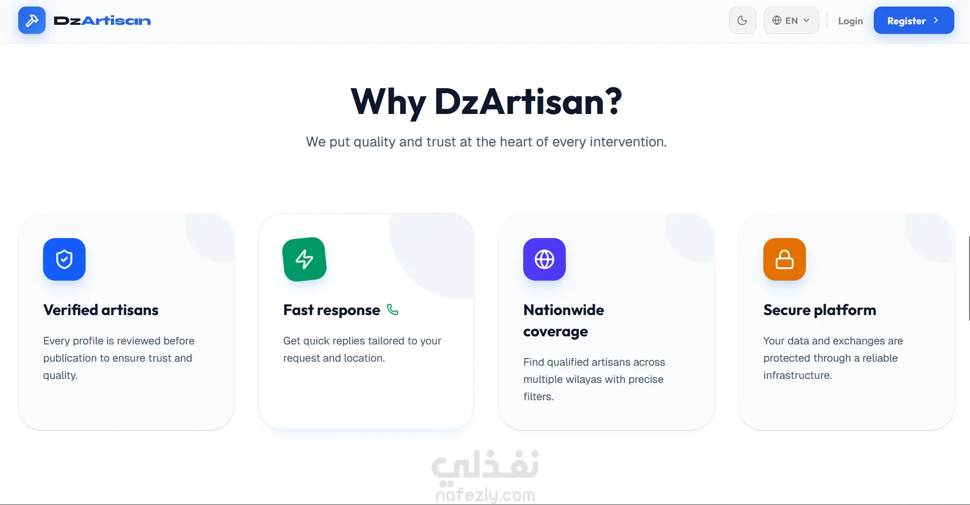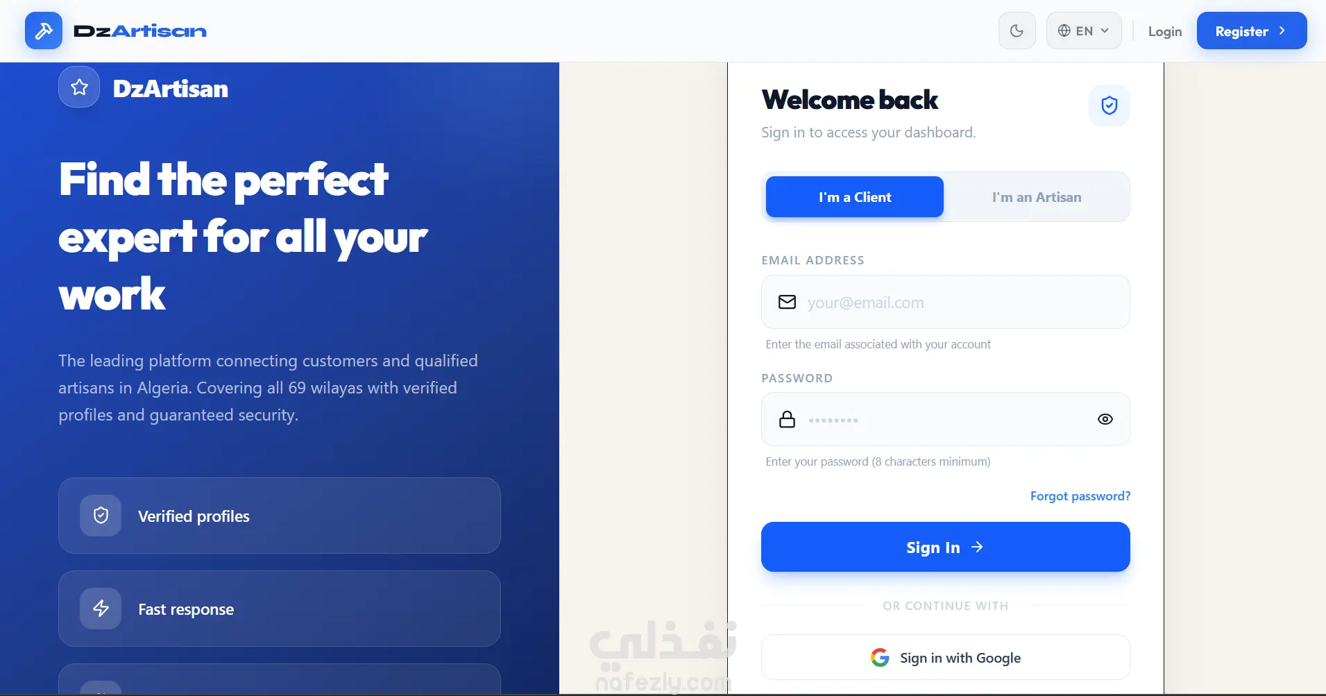 تطوير منصة رقمية شاملة تهدف إلى تنظيم وتسهيل الوصول إلى الكفاءات المهنية والحرفية. يُعد هذا المشروع نظاماً إدارياً متكاملاً يدير دورة العمل بالكامل، بدءاً من طرح الطلب وصولاً إلى التنفيذ والتقييم، مع تغطية جغرافية واسعة ونظام حماية متطور. الميزات الوظيفية التي تم تنفيذها: نظام الصلاحيات المتعددة: بناء هيكلية تسمح بإدارة ثلاثة أنواع من المستخدمين (العملاء، المحترفين، ومديري النظام)، مع توفير بيئة عمل مخصصة لكل فئة. لوحة تحكم إدارية مركزية: تتيح للإدارة الرقابة الكاملة على المنصة، التحقق من الوثائق الرسمية لمزودي الخدمة، وإدارة النزاعات والتقارير. بوابة مزودي الخدمة (الحرفيين): لوحة تحكم تتيح للمهنيين بناء ملف شخصي موثق، استقبال طلبات العمل، وإدارة عروضهم التجارية بشكل احترافي. نظام طلب الخدمات الذكي: يتيح للعملاء نشر احتياجاتهم وتلقي عروض أسعار مختلفة والمقارنة بينها بناءً على التقييمات والجودة. محرك بحث جغرافي متطور: نظام يعتمد على التوزيع الجغرافي لضمان ربط العملاء بأقرب المحترفين المتاحين في منطقتهم بدقة عالية. مركز الرسائل الداخلي: توفير قناة تواصل آمنة ومباشرة بين الطرفين لتنسيق المواعيد وتفاصيل العمل داخل المنصة. نظام التوثيق والموثوقية: آليات متطورة لضمان أمن البيانات والتحقق من جودة الملفات الشخصية قبل تفعيلها على المنصة. القيمة المضافة للمشروع: تجربة مستخدم انسيابية: تصميم واجهات تركز على سهولة الوصول وسرعة التنفيذ لضمان تجربة مريحة لكافة الفئات العمرية. هندسة قواعد البيانات: بناء بنية تحتية قادرة على معالجة آلاف الطلبات المتزامنة وضمان استقرار النظام تحت ضغط الاستخدام العالي. التجاوب الكامل: النظام يعمل بكفاءة مطلقة على كافة الشاشات، من الهواتف المحمولة إلى أجهزة الحاسوب المكتبية.