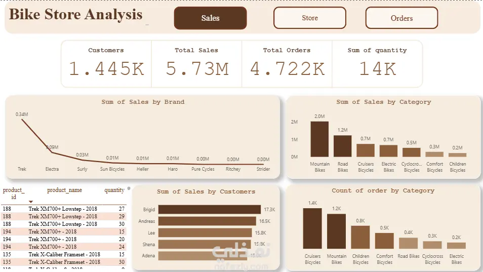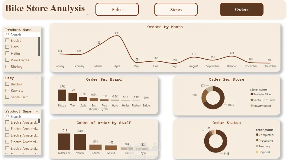 قمتُ بتنظيف البيانات وإعدادها، وتصميم نموذج البيانات، وإنشاء لوحة معلومات Power BI من ثلاث صفحات لتحويل الجداول الخام إلى رؤى قابلة للتنفيذ. تحليل المبيعات: أنشأتُ بطاقات مؤشرات الأداء الرئيسية ورسومًا بيانية لتتبع إجمالي المبيعات، واتجاهات الإيرادات، وأهم الفئات والعلامات التجارية، ومساهمة كل عميل. تُبرز هذه الصفحة موسمية المبيعات، ومجموعات المنتجات التي تُحقق أعلى الإيرادات، والأنماط الناشئة في سلوك العملاء. أداء المتاجر: تُقارن هذه الصفحة الفروع من حيث حجم المبيعات والطلبات، وتُظهر حصة كل متجر، وتُحدد المواقع التي تُحقق أداءً أفضل أو أسوأ. تُساعد هذه الصفحة في تحديد فرص إعادة تخصيص الموارد والتحسين المُوجّه على مستوى الفرع. نظرة عامة على الطلبات: تتضمن هذه الصفحة اتجاهات الطلبات الشهرية، والطلبات حسب العلامة التجارية والموظفين، وتفاصيل حالة الطلبات. تكشف هذه الصفحة عن أشهر ذروة الطلبات، ومؤشرات أداء الموظفين، والاختناقات التشغيلية مثل الشحنات المُعلقة أو المُتأخرة.