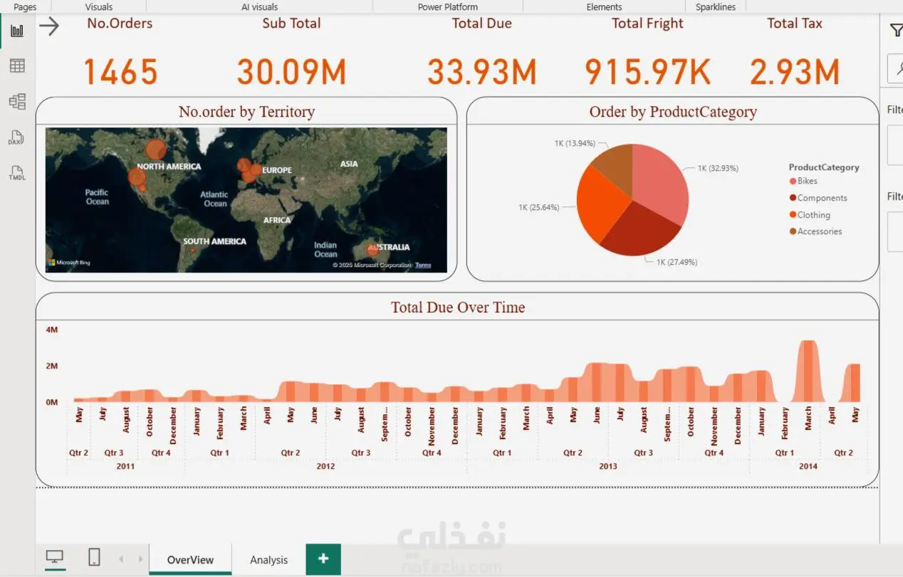 تم إنشاء لوحة معلومات تفاعلية باستخدام Power BI لتحليل بيانات المبيعات على مستوى عالمي. تعرض اللوحة عدد الطلبات، إجمالي المبالغ المستحقة، الضرائب، وتكاليف الشحن، بالإضافة إلى توزيع المبيعات حسب الفترات الزمنية، المناطق الجغرافية، وفئات المنتجات. كما تم تضمين خرائط تفاعلية ورسوم بيانية لتوضيح الأنماط والاتجاهات، بهدف دعم القرارات
