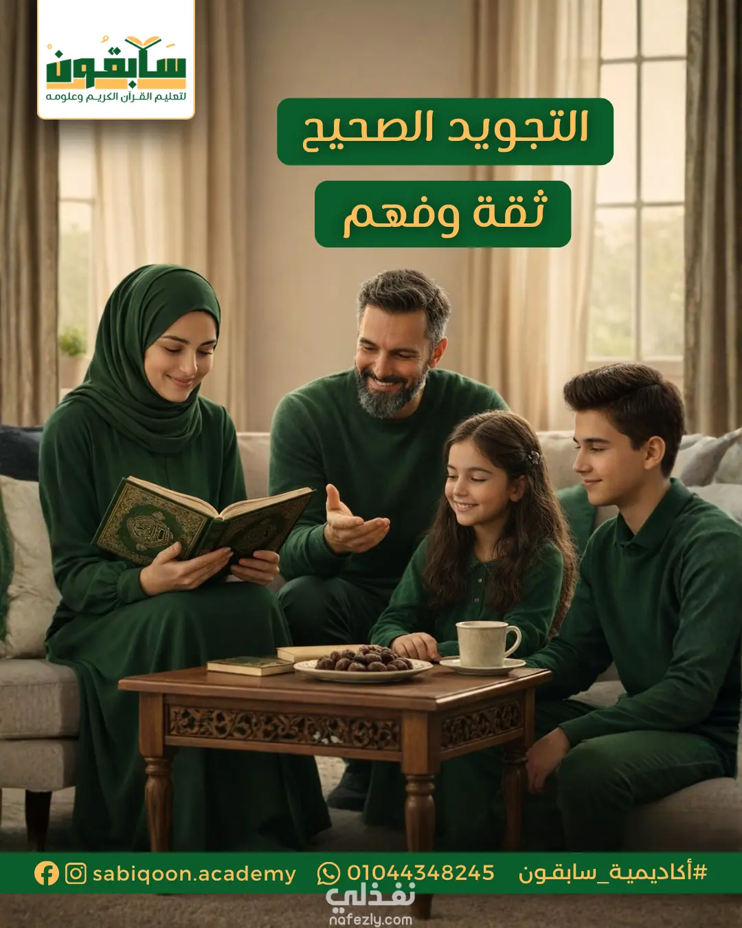 تصميم سوشيال ميديا يركز على الجانب التربوي والأسري، تم تنفيذه لصالح "أكاديمية سابقون" لتعزيز قيمة تعلم التجويد الصحيح داخل المنظومة العائلية. ركزت في هذا التصميم على: سيكولوجية الألوان: الحفاظ على التناغم بين درجات اللون الأخضر (المرتبط بالهوية وبالهدوء النفسي) وتوحيد لون ملابس الشخصيات في الصورة ليعكس التناغم والوحدة الأسرية. التوجيه البصري (Visual Flow): وضع النص الرئيسي "التجويد الصحيح.. ثقة وفهم" في أعلى التصميم بخلفية متباينة لضمان سرعة القراءة وجذب الانتباه فوراً. اختيار العناصر البصرية: استخدام صورة عائلية ذات إضاءة طبيعية دافئة لتعزيز شعور الأمان والمصداقية لدى أولياء الأمور، وهي الفئة المستهدفة الأساسية. التوازن والمحاذاة: توزيع عناصر التواصل الاجتماعي وأرقام الهاتف في أسفل التصميم بشكل منظم (Footer) يحافظ على نظافة التصميم ولا يشتت المشاهد عن الرسالة الأساسية.