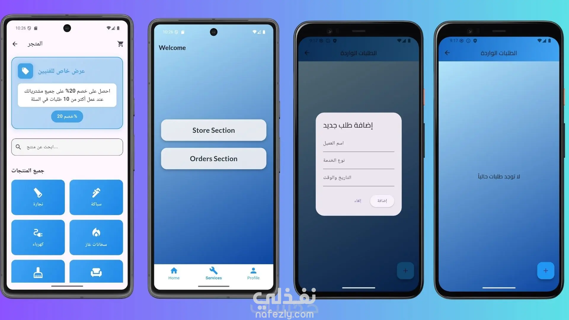 هذا تطبيق يعمل علي عرض الفنيين والمهارات الخاصه بيهم ويسمح للعملاء ب التواصل معهم لطلب الخدمه الذين يريدنها