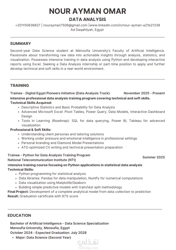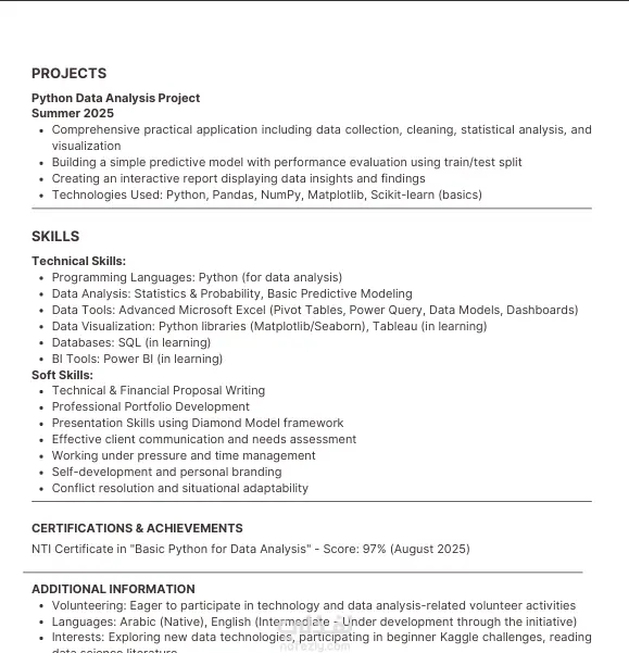 "هل تعلم أن أكثر من 70% من السير الذاتية يتم استبعادها قبل أن يراها مسؤول التوظيف لأنها غير متوافقة مع أنظمة ATS؟ أقدم لك خدمة صياغة سيرة ذاتية احترافية تضمن لك: تجاوز أنظمة الفرز: استخدام كلمات مفتاحية (Keywords) دقيقة تتناسب مع الوصف الوظيفي الذي تستهدفه. تنسيق ذكي: تصميم هيكل نظيف، واضح، وخالٍ من العناصر الرسومية المعقدة التي تعيق قراءة الأنظمة الآلية. صياغة إنجازية: تحويل مسؤولياتك السابقة إلى "إنجازات" قابلة للقياس بلغة مهنية قوية. تحسين الملف الشخصي: تنسيق المعلومات بطريقة تبرز نقاط قوتك التقنية والمهنية بشكل مباشر وسريع.