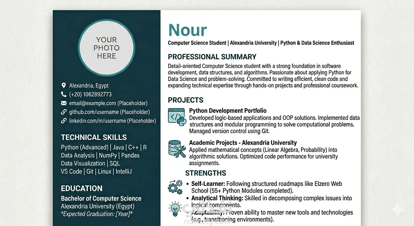 Tech enthusiast and Computer Science student at Alexandria University, deeply invested in the ever-evolving world of software engineering and automation. Skilled in Python and data manipulation, with a strong passion for building smart, efficient solutions. I thrive on learning new technologies and applying logical frameworks to solve real-world digital challenges."