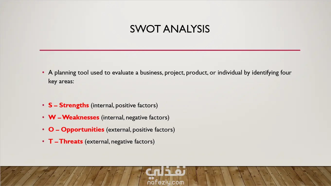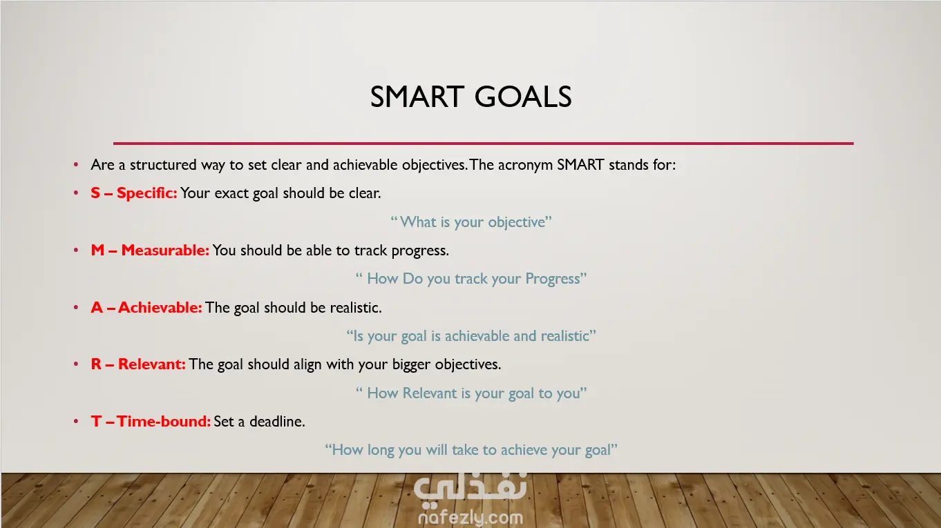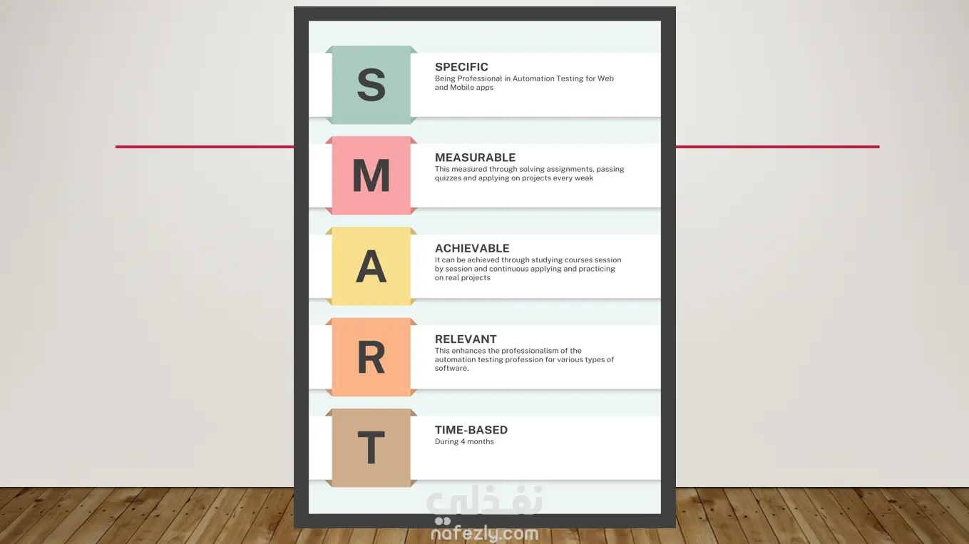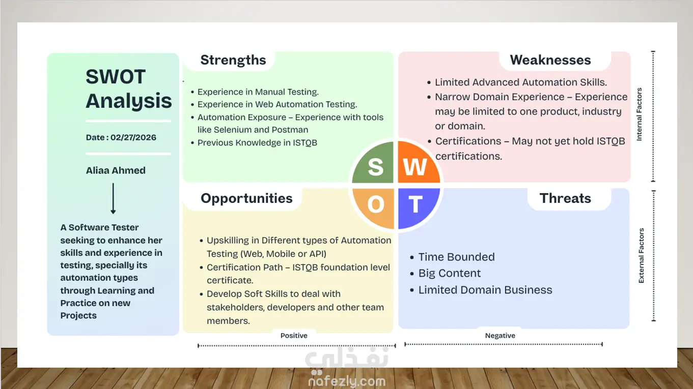 - قمت بتصميم عرض تقديمي عن التخطيط المهني Career Planning لتوضيح اهم نقاط القوة نقاط الضعف الفرص المتحة و التحديات التي تواجهنا كل هذا في مقابل الهدف المطلوب الوصول ايه وهو ما يسمى SWOT Analysis . - العرض التقديمي ايضا يتضمن عدة مقاييس للهدف مثل امكانية تحقيقه و كيفية تحقيقه و الوقت المتاح لتحقيقه و هو ما يسمى SMART goals. - كان هذا الهدف تقني و هو الوصول الى الاحترافية في اتمتة مواقع الويب . - العرض التقديمي يتضمن صور تم تصميمها على موقع Canva . - كان العرض التقديمي مقدم باللغة الانجليزية .