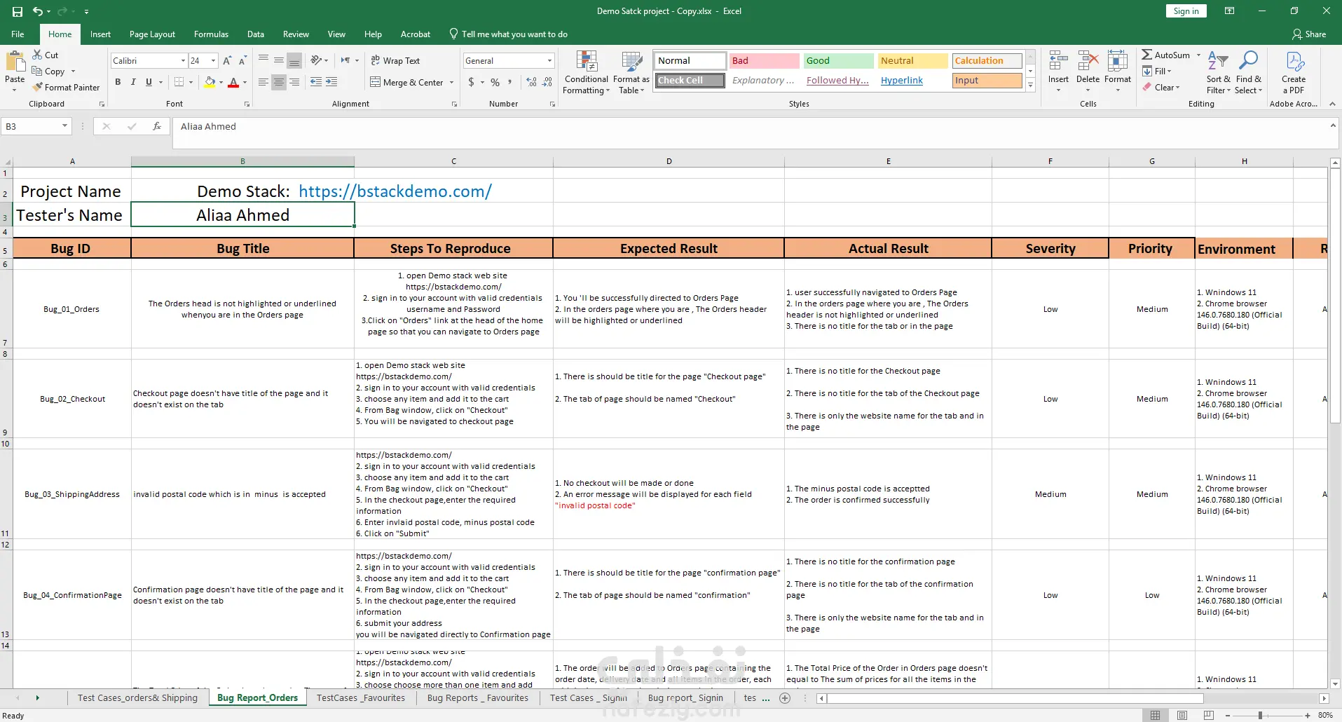 - في تقرير الخطأ تم اضافة وصف للخطأ و خطوات لاعادة اظهاره و بيئة العمل المستخدمة و مدى تأثير هذا الخطأ على باقي اجزاء الموقع مع ارفاق لقطات شاشة screenshots لتوثيق و توضيح الخطأ