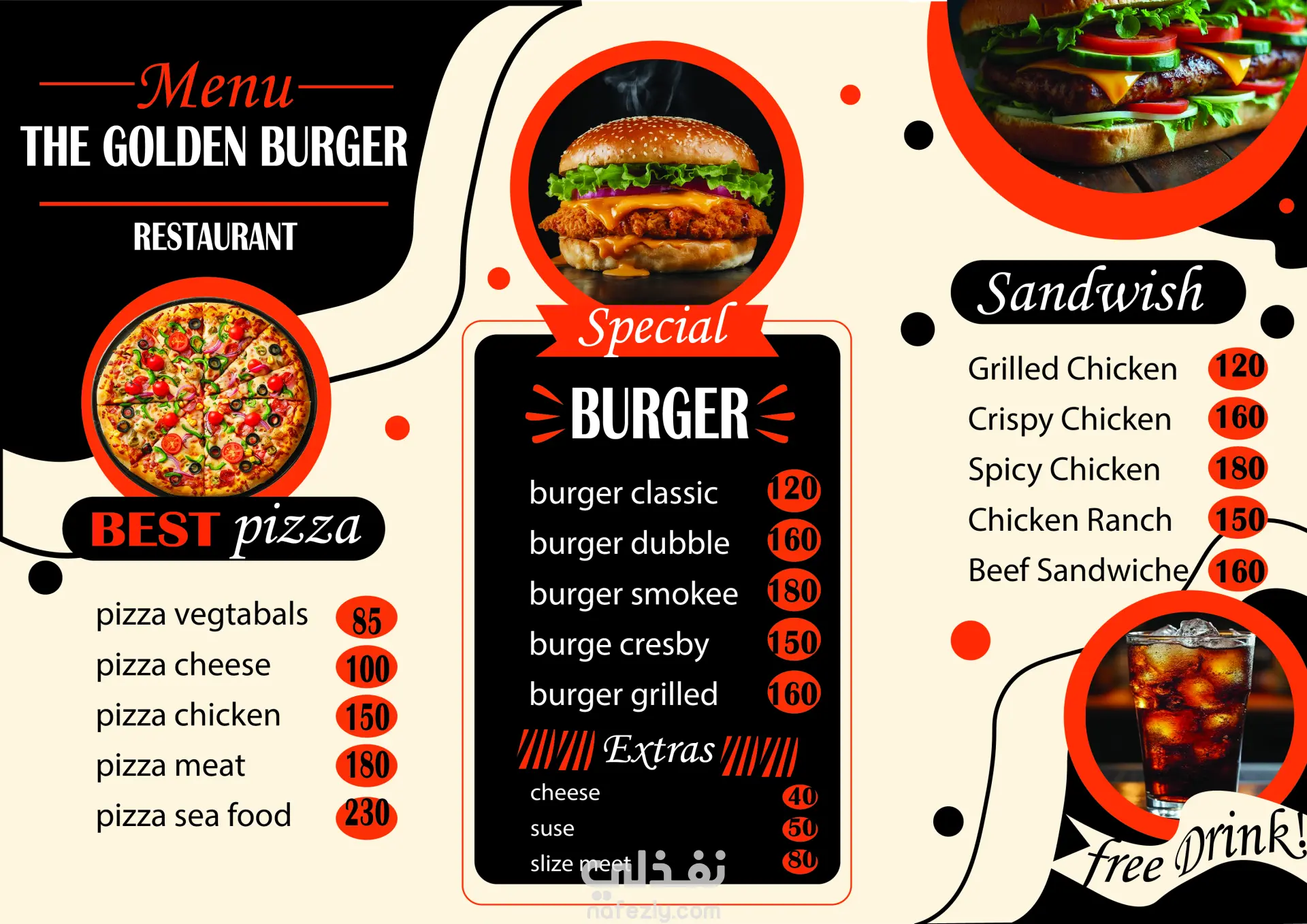 مشروع تصميم منيو لمطعم برجر يهدف إلى تقديم تجربة بصرية شهية وجذابة تعكس طابع المطعم. تم الاهتمام بتوزيع العناصر بشكل متوازن، واستخدام أسلوب تصميم حديث يبرز الأصناف بطريقة تشجع العميل على الطلب، مع مراعاة وضوح الأسعار وسهولة القراءة.