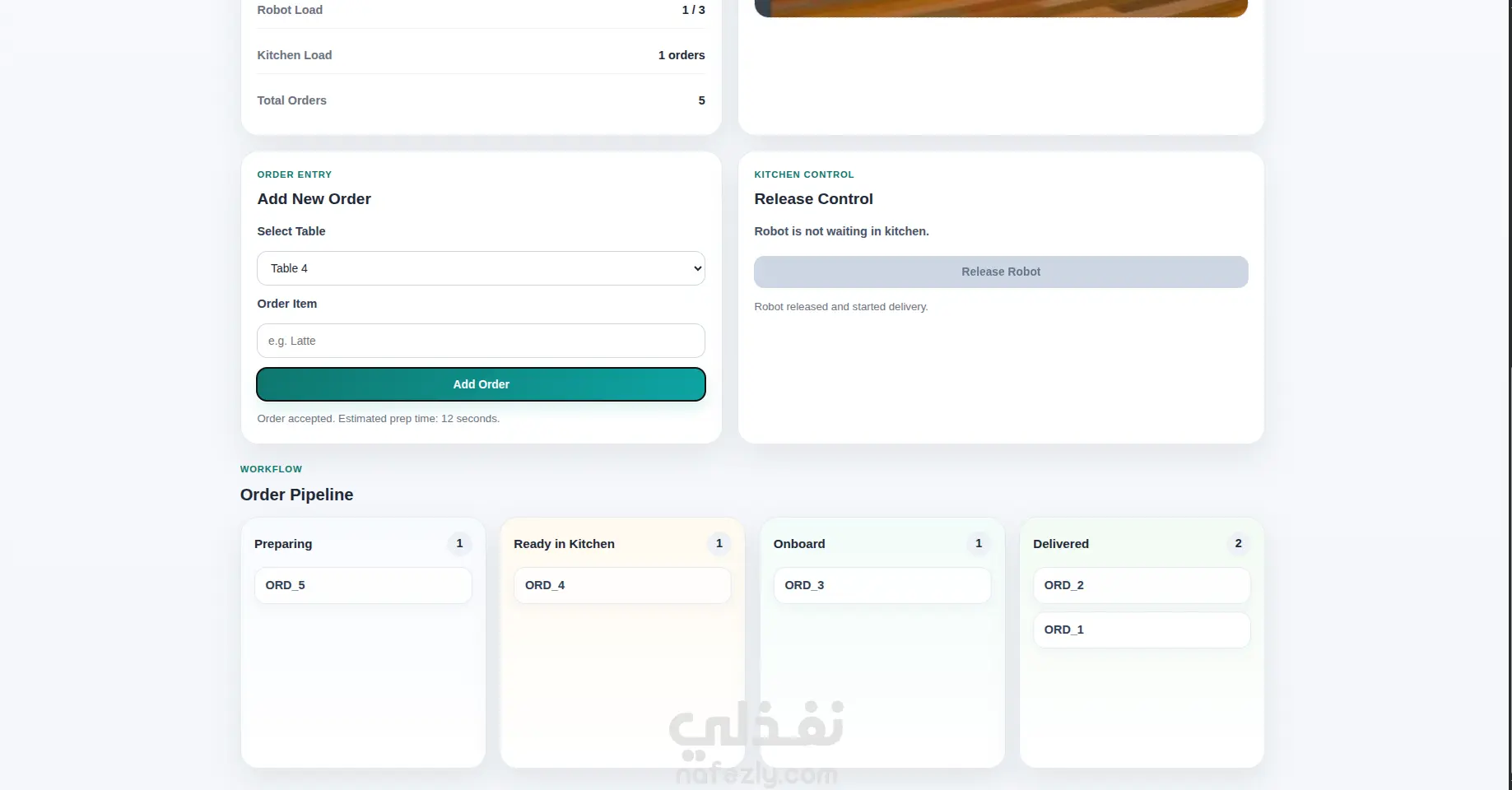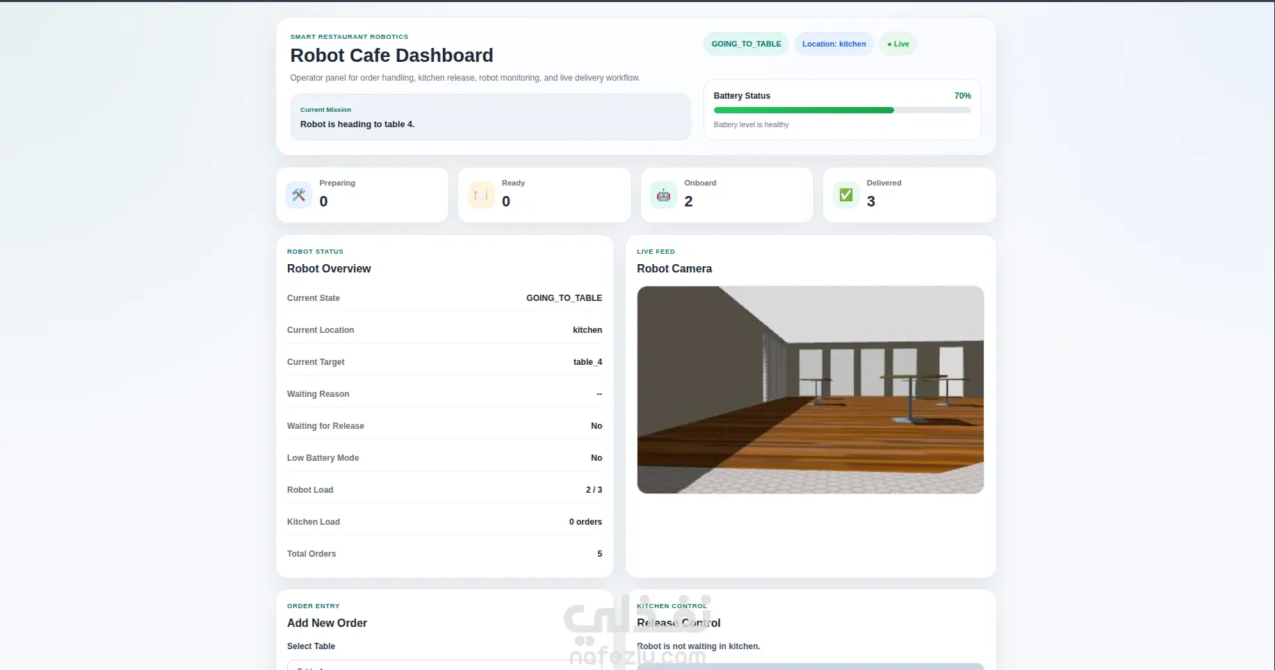قمت بتطوير نظام روبوت متكامل لمحاكاة روبوت يقدم خدمات داخل كافيه بشكل ذاتي باستخدام ROS2 وGazebo. 🔹 ماذا يفعل النظام؟ * التنقل الذاتي داخل البيئة (Autonomous Navigation) * استقبال الطلبات وتنفيذها * توصيل الطلبات للطاولات * عرض حالة الروبوت لحظيًا * بث مباشر من كاميرا الروبوت * محاكاة كاملة لبيئة كافيه (مطبخ – طاولات – شحن) 🔹 أهم ما تم تنفيذه: * تصميم الروبوت باستخدام URDF/Xacro * دمج حساسات LiDAR و IMU و Camera * استخدام EKF لدمج بيانات الحساسات وتحسين تحديد الموقع * إعداد Navigation2 للتحكم في الحركة الذاتية * بناء نظام إدارة مهام (Task Manager) لتنظيم الطلبات * تطوير واجهة ويب باستخدام Flask للتحكم والمتابعة 🔹 قيمة المشروع: هذا المشروع يمثل نظام متكامل يمكن تطبيقه في: * المطاعم الذكية * روبوتات التوصيل * المستشفيات والأنظمة اللوجستية