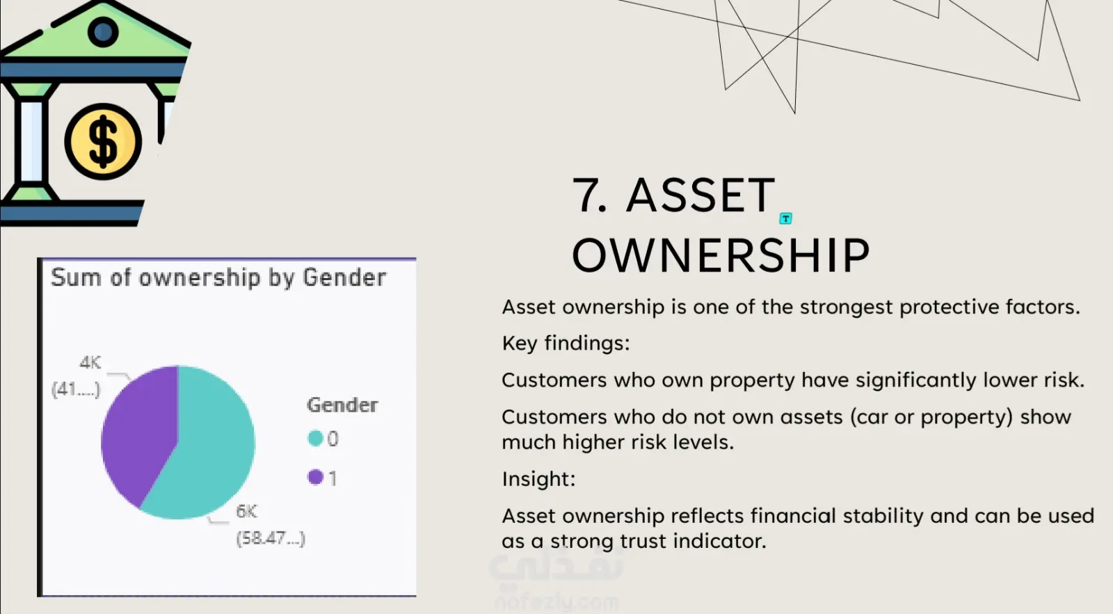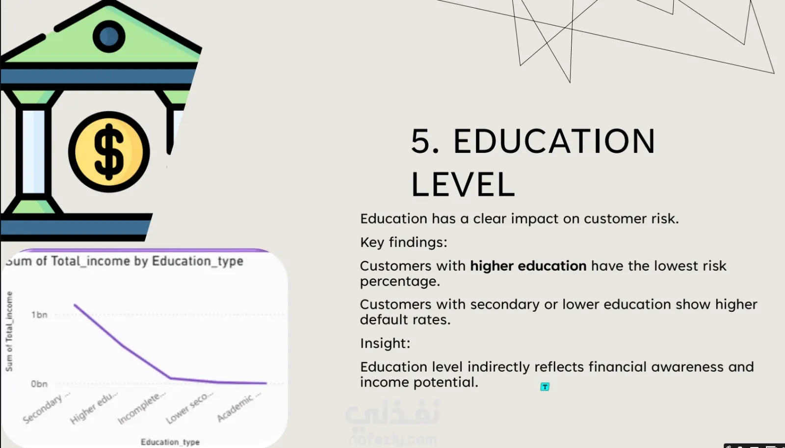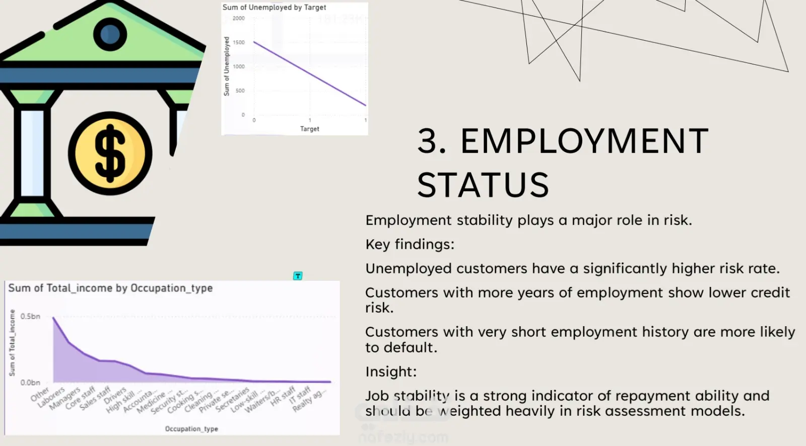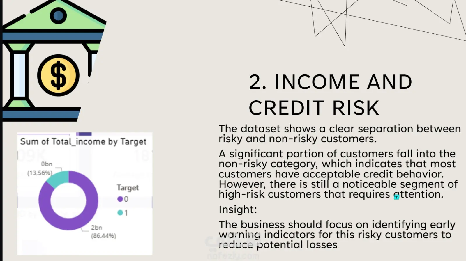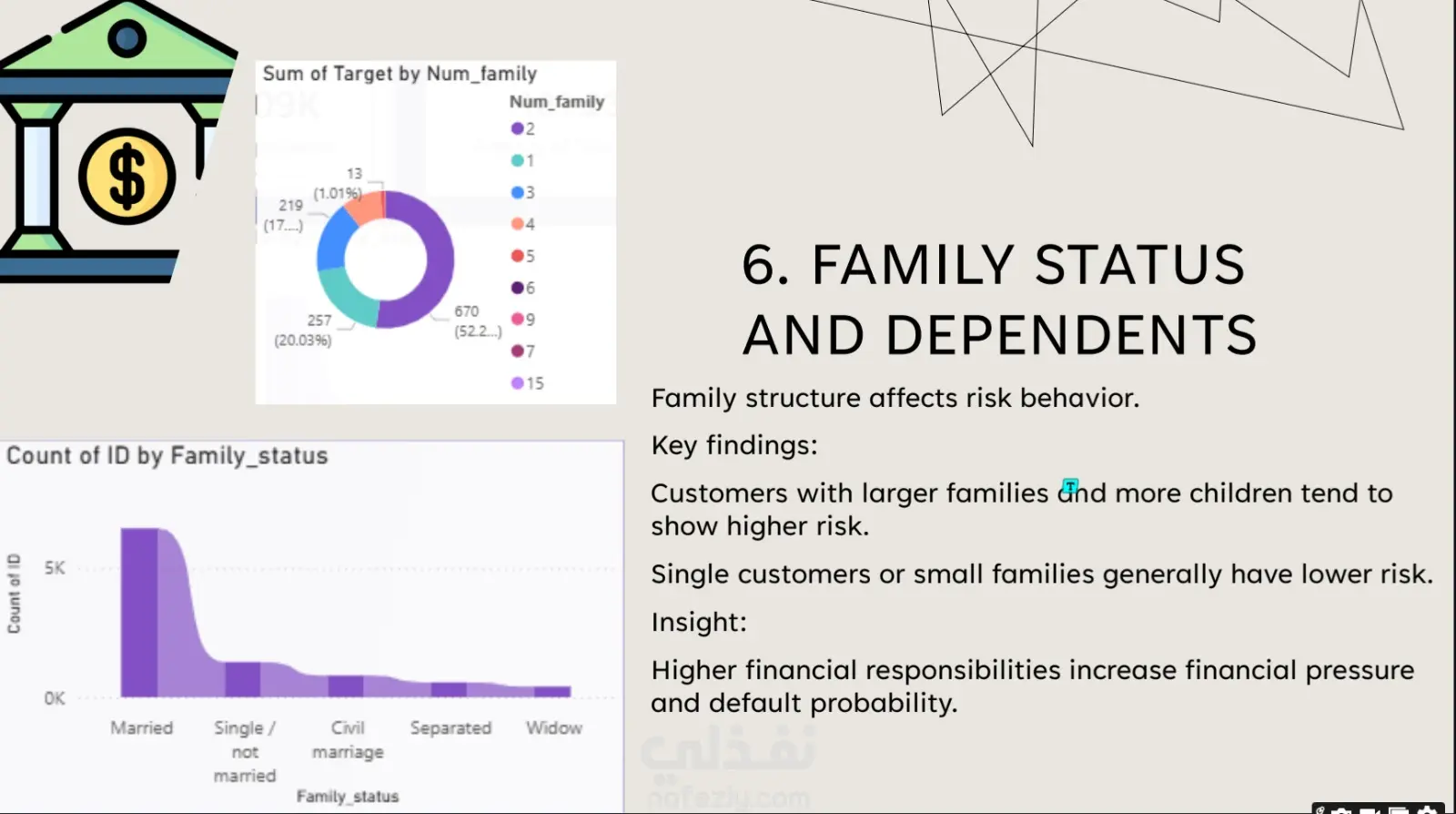 في هذا المشروع، قمت بتطوير تقرير تحليلي شامل يركز على دراسة ديموغرافية العملاء (Customer Demographic Analysis).الهدف الرئيسي من المشروع: تحليل بيانات العملاء وتحديد العوامل الأساسية التي تؤثر بشكل مباشر على المخاطر الائتمانية (Credit Risk) للشركات والبنوك.نظرة عامة على البيانات: تم إجراء التحليل على قاعدة بيانات ضخمة تضم 9,709 عميلاً، واشتملت على 22 متغيراً مختلفاً يغطي الجوانب الديموغرافية، المالية، الوظيفية، ومعلومات الأصول والممتلكات.أبرز الرؤى والنتائج المستخرجة (Key Insights):الاستقرار المالي والوظيفي: أظهرت النتائج أن الاستقرار المالي (الذي يجمع بين الدخل، حالة التوظيف، والأصول) هو الدافع الأقوى في تحديد مستوى مخاطر العميل. كما تبين أن العملاء العاطلين عن العمل يمثلون نسبة مخاطرة أعلى بشكل ملحوظ.تأثير العمر والتعليم: العملاء في منتصف العمر (الفئة النشطة مالياً) يظهرون أقل مستويات المخاطرة. كذلك، يمتلك العملاء ذوو التعليم العالي النسبة الأقل من المخاطر الائتمانية.الأصول والسكن: العملاء الذين يمتلكون أصولاً (كالعقارات) يمثلون مخاطرة أقل بكثير مقارنة بغيرهم. كما أن السكن المستقر (مثل المنازل أو الشقق المملوكة) يقلل من عدم اليقين المالي وبالتالي يقلل المخاطر.الحالة الاجتماعية: العملاء الذين لديهم عائلات كبيرة يميلون إلى إظهار مخاطر أعلى.القيمة المضافة للأعمال (Business Impact): لم يقتصر المشروع على عرض البيانات، بل قمت بتلخيص "ملفات تعريف المخاطر" (Risk Profiles) لتحديد صفات العميل عالي المخاطر ومنخفض المخاطر بدقة. وتم تقديم توصيات استراتيجية للإدارة تشمل:إعطاء الأولوية للعملاء ذوي الدخل المستقر والأصول.تطبيق قواعد أكثر صرامة على العملاء العاطلين أو ذوي الدخل المنخفض.إمكانية استخدام هذه المتغيرات لبناء نموذج تنبؤي لتسجيل الائتمان مستقبلاً (Predictive credit scoring model)