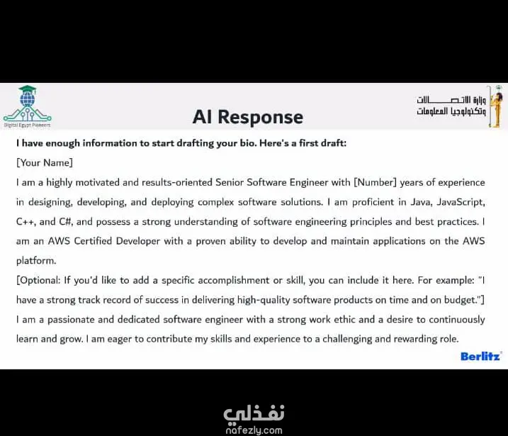 في هذا المشروع، قمت بتوظيف مهاراتي في اللغة الإنجليزية والأعمال لصياغة نبذة تعريفية (Professional Bio) احترافية تتبع هيكلية عالمية (نموذج Berlitz).