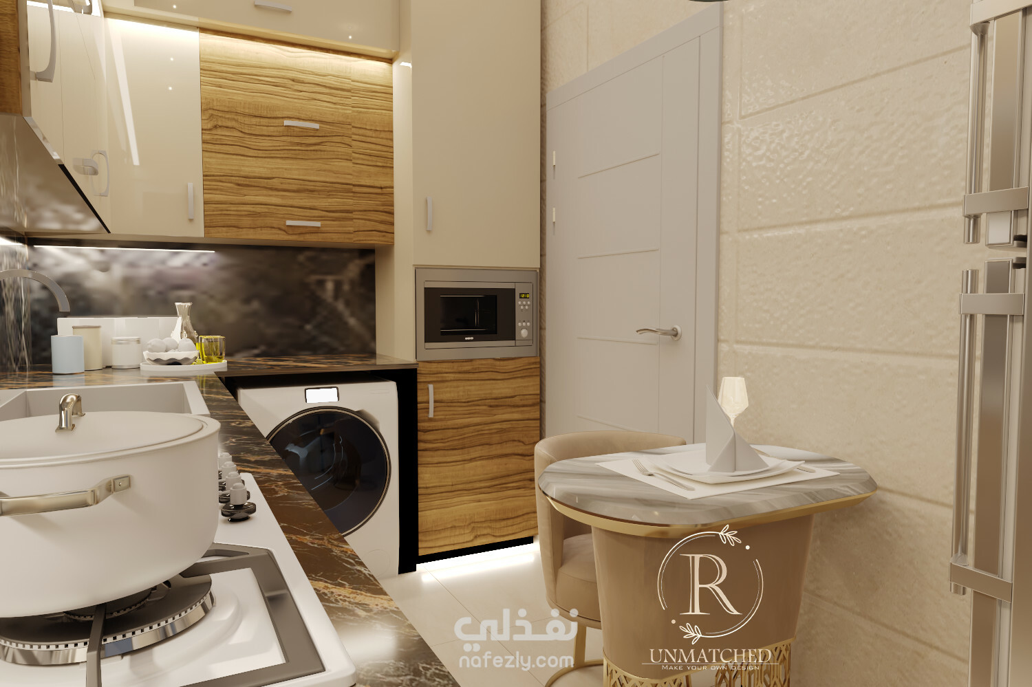 تصميم مطبخ عصري يناسب ذوق العميل قمت باستغلال المساحات بقدر الامكان و مراعاة سهولة الحركة لضيق المساحة تم اختيار الوان و خامات عصرية تواكبالحداثة و التطور