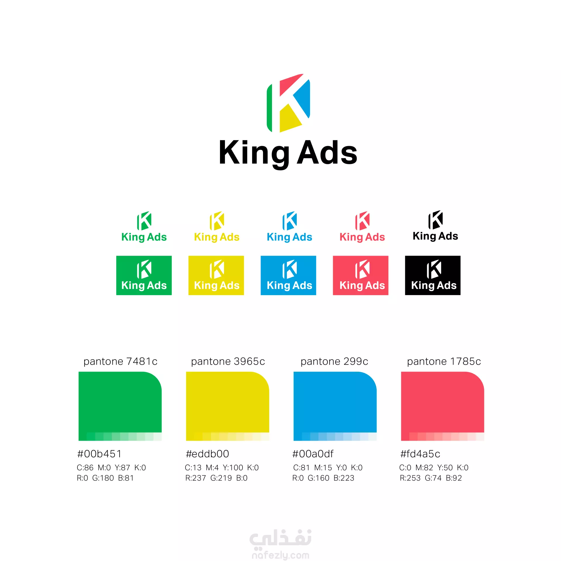 king ads هي شركة تسويقية على مختلف مواقع التواصل الاجتماعي . تم تصميم الشعار على شكل الحرف k بداية كلمة king . تم استخدام الوان مختلف شعارات مواقع التواصل الاجتماعي . البرامج المستخدمة : أدوبي Ps أدوبي Ai