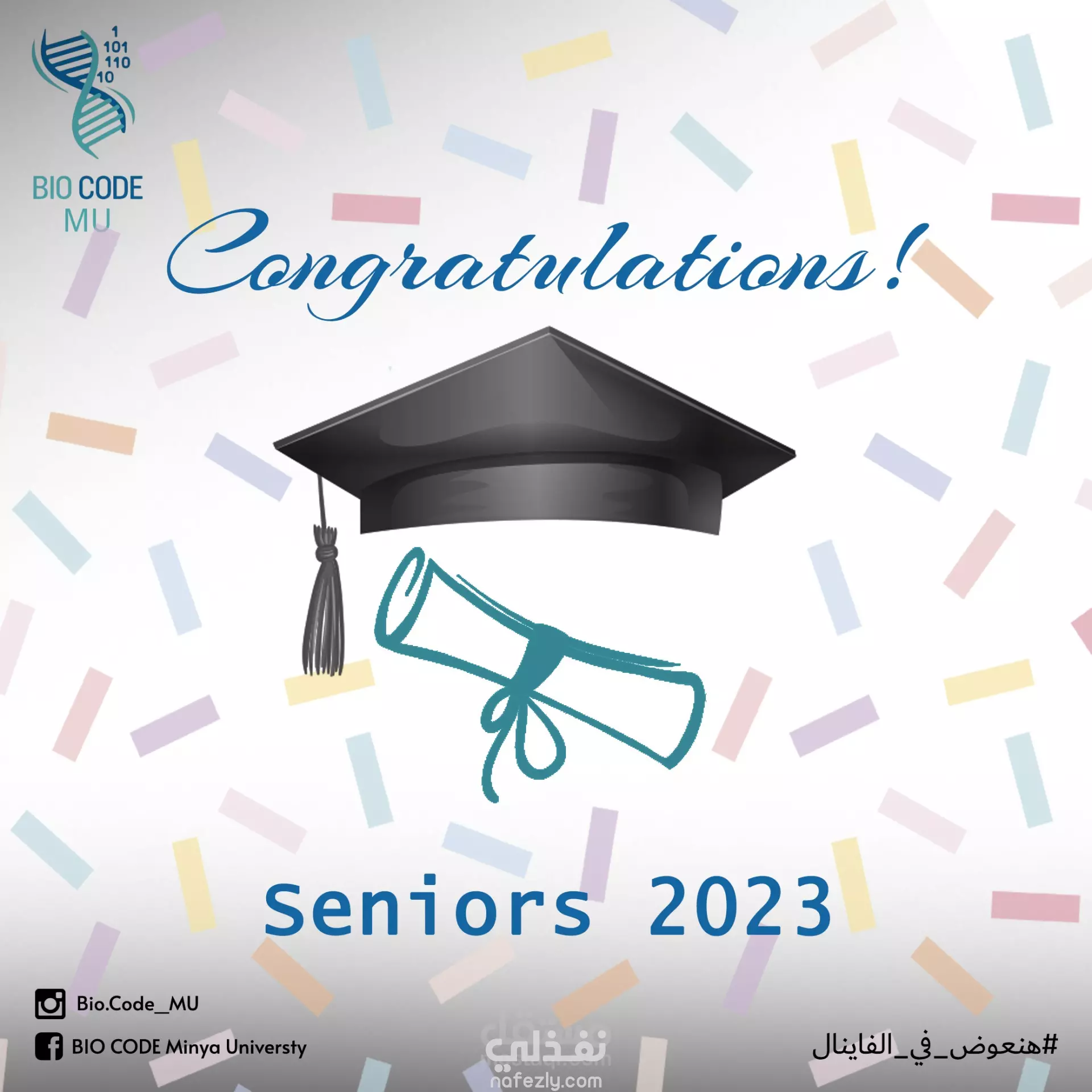 تصميمات سوشيال ميديا لحملة تسويقية علي الفيس بوك لتهنئة الطلاب بمناسبة نهاية الامتحانات وتم تخصيص التهنئة للطلاب ال siniors السابقون والقادمون العمل يتميز بالبساطة والتناس مع الهوية البصرية للمؤسسة بالوانها ونوع الخط المستخدم يتكون التصميم من الصورة Vector وعنوان بخط عربي مميز بالاضافة الي اطار ثابت يتكون من اللوجو وال وسائل التواصل والهاشتاج