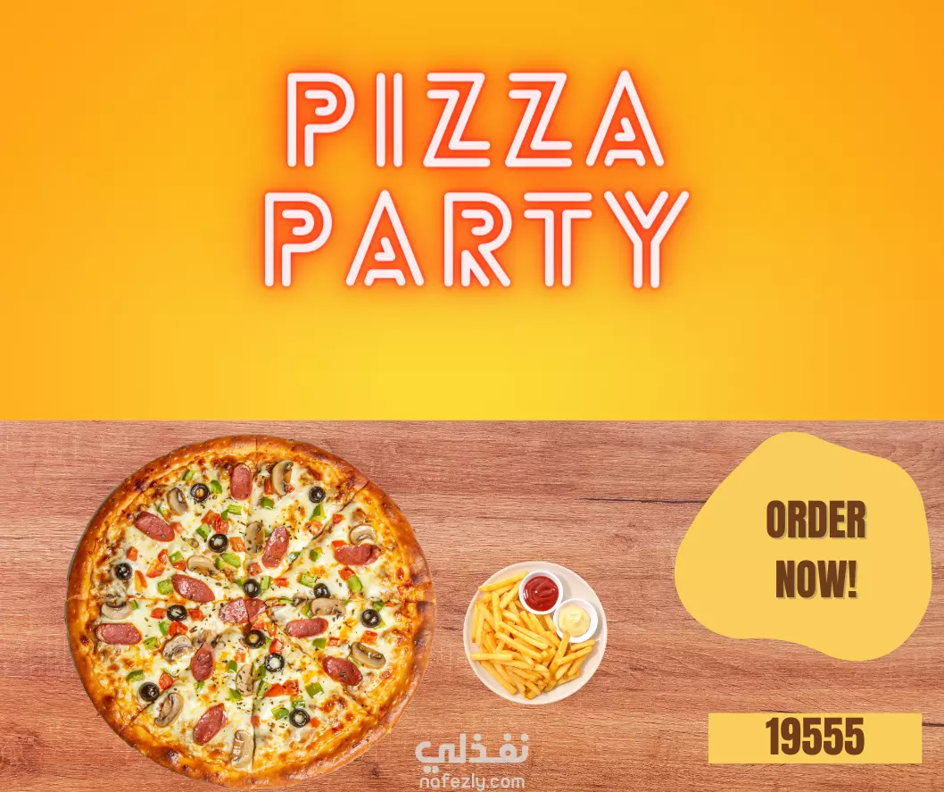 يغلب عليه ألوان ساطعة .. تخيل طاولة عليها طعامك يمكنك طلبه أيضا بالهاتف. العنوان المكتوب على التصميم ب ستايل إضاءة النيون.