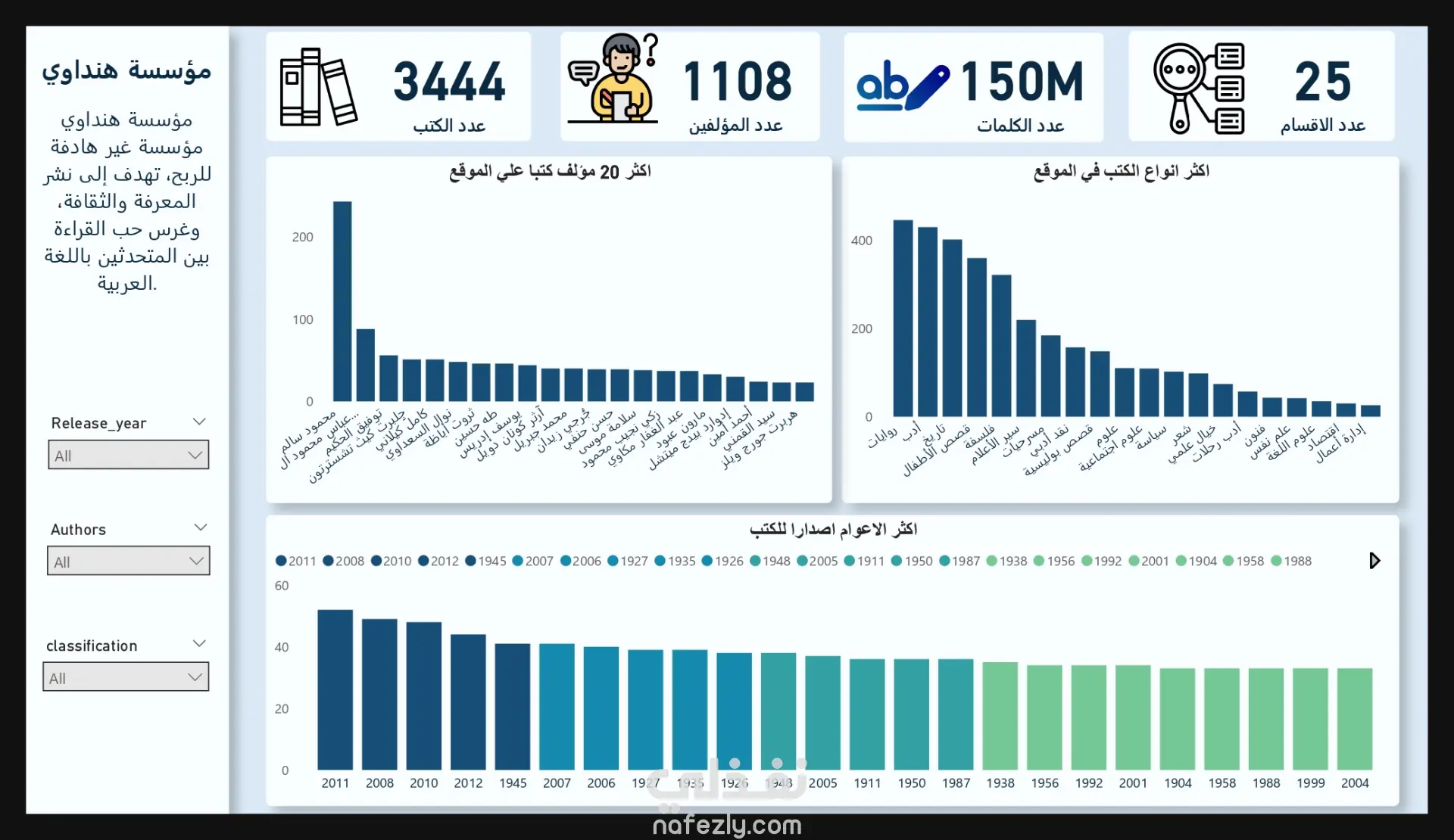 جاهزية للتكامل مع لوحات Power BI لعرض إحصاءات مثل الكتب حسب الفئة أو تطور الإصدارات عبر السنين.