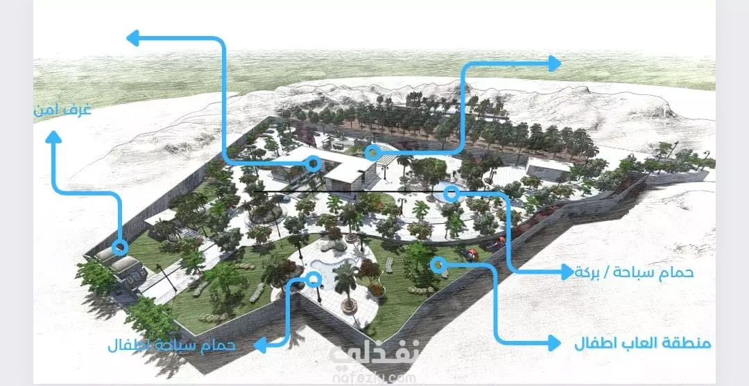 تم تصميم المشروع بدول عمان وفقا للنظم الهندسية ويتكون التصميم من مبني 1000 متر وحمام سباحه ومزرعه فواكه وموالح والعالب اطفال ولاندسكيب وهاردسكيب