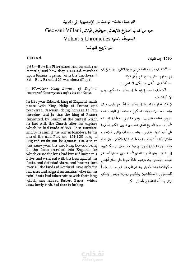 جزء من كتاب المؤرخ الإيطالي جيوفياني فيلليني Geovani Villani المعروف باسم :Villani’s Chroniciles عن تاريخ فلورنسا وما جرى بها من وقائع خلال القرن الرابع عشر بعد الميلاد.