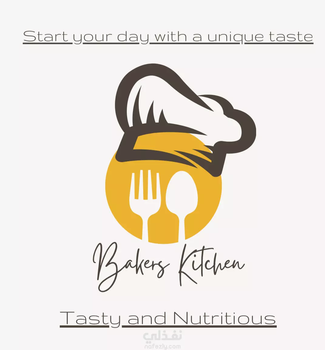 الشعار يتكون من عناصر بصرية جذابة تجمع بين أدوات المطبخ وشكل قبعة الطاهي، مما يعكس هوية "Bakers Kitchen" بشكل مميز. في وسط الشعار، يوجد رمز دائري بلون أصفر يحتوي على شوكة وملعقة، مما يرمز إلى الأطعمة والمأكولات. تعلو الرمز قبعة الطاهي باللون الأبيض والأسود، مما يشير إلى التخصص والاحترافية في مجال الطهي. تحت الرمز، يظهر اسم "Bakers Kitchen" بخط يدوي أنيق، مما يضفي لمسة شخصية ودافئة على الشعار. في الأعلى، عبارة "Start your day with a unique taste" (ابدأ يومك بمذاق فريد) بخط رقيق وجذاب، بينما في الأسفل، عبارة "Tasty and Nutritious" (لذيذ ومغذي) بخط مشابه، مما يعزز الرسالة العامة للشعار.
