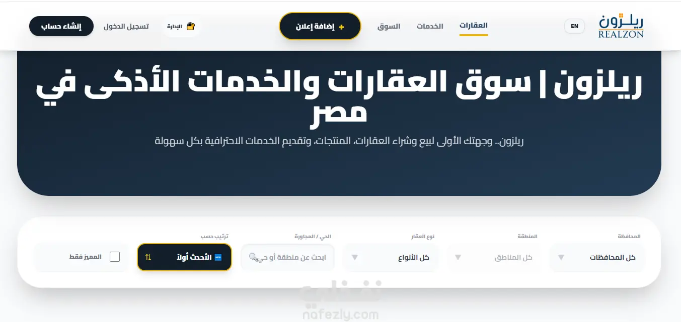 Realzon هي منصة إلكترونية عقارية وخدمية متكاملة مصمَّمة لتسهيل عملية البحث عن العقارات وبيعها أو تأجيرها، بالإضافة إلى تقديم خدمات متنوعة في السوق التجاري لجميع المستخدمين. تُوفِّر المنصة واجهة جذابة تسمح للمستخدمين بتصفح الشقق والمنازل المتاحة للبيع أو الإيجار، وتبادل السكن، واكتشاف عروض عقارية مميزة بسهولة.