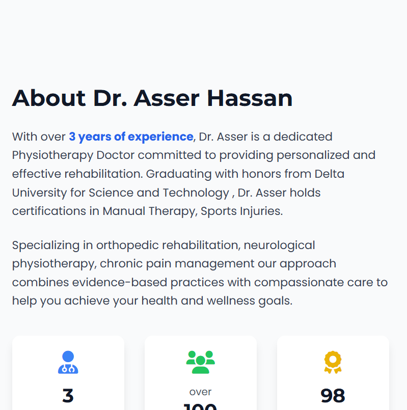 السلام عليكم دكتور، يشرفني أساعدك في تصميم موقعك الشخصي كطبيب علاج طبيعي، سأقوم بتصميم موقع إلكتروني عصري واحترافي يعكس شخصيتك كطبيب علاج طبيعي ويج...