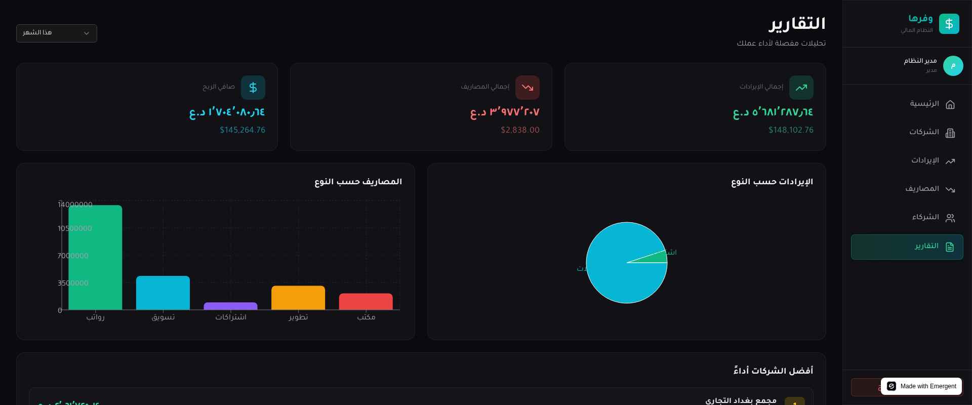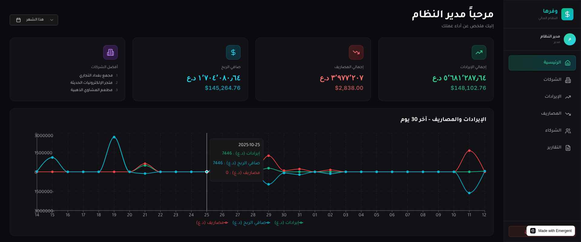 السلام عليكم اخي من خلال الصور المرفقة انت تريد بناء لوحة تحكم لمتابعة شركتك او شغلك استطيع قيام بتلك الوظيفة لك لقد قمت بالعديد من لوحات التحكم...